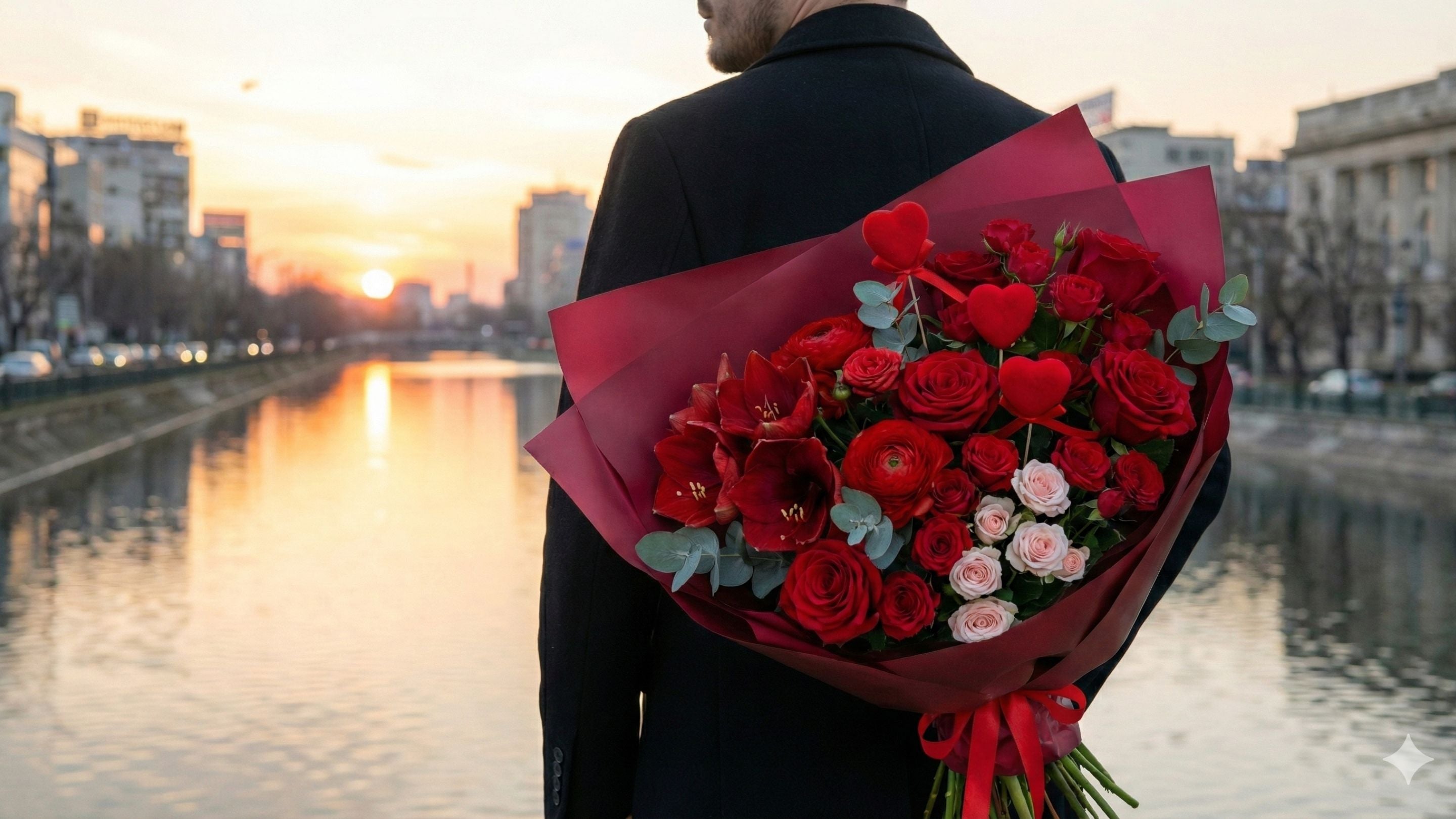 Buchet de Flori 11 Trandafiri Rosii si Eucalipt