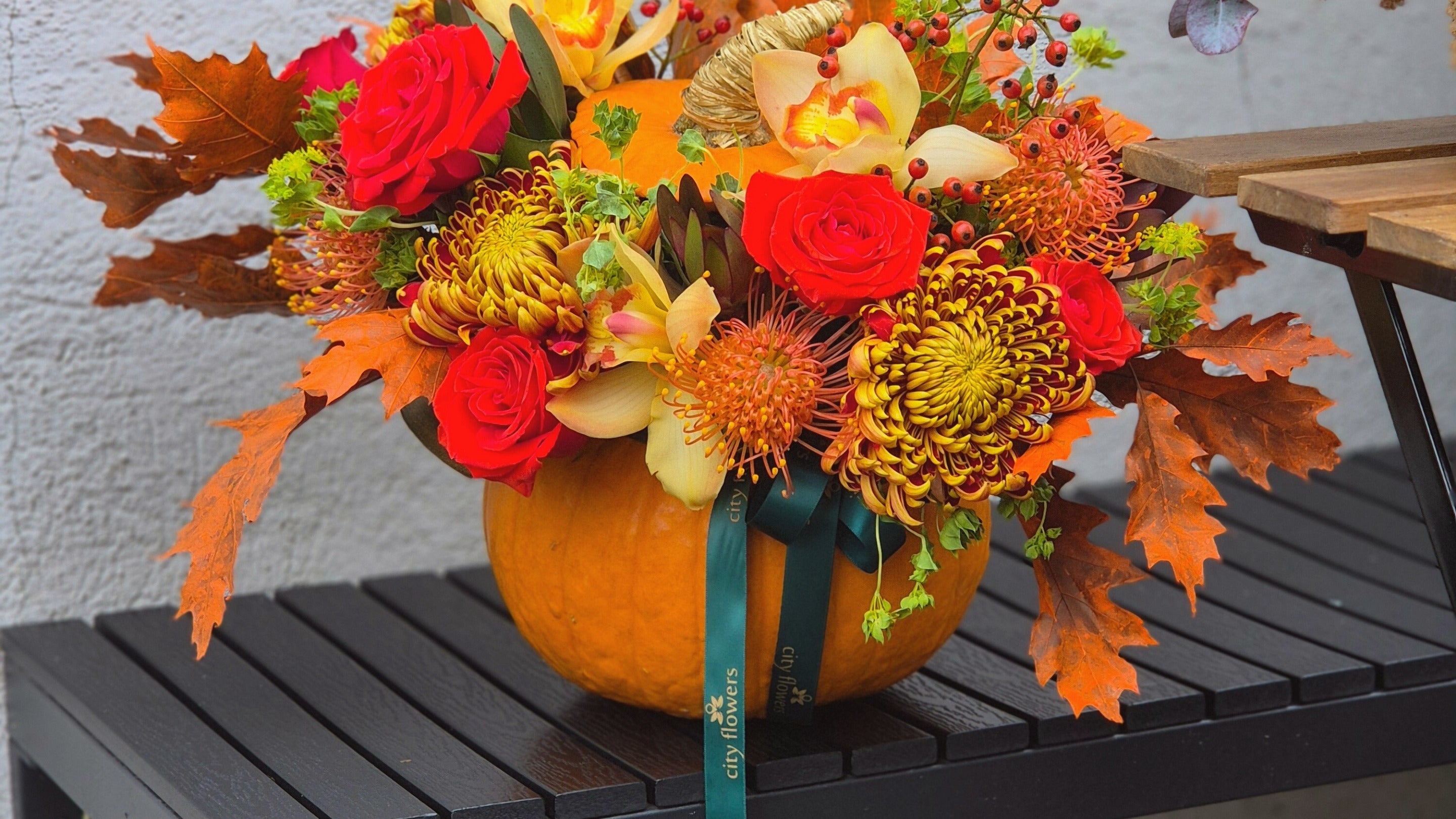 Aranjament Floral in Dovleac cu Flori Rosii si Accente Aurii