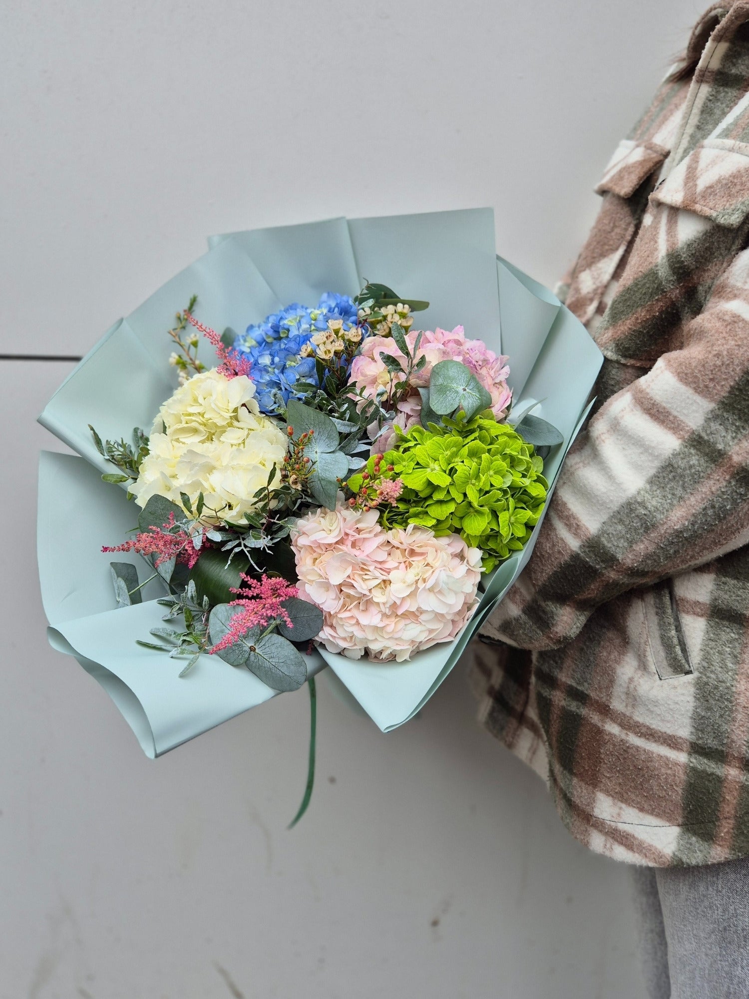 Buchet de Flori Pastel cu Hortensii si Trandafiri