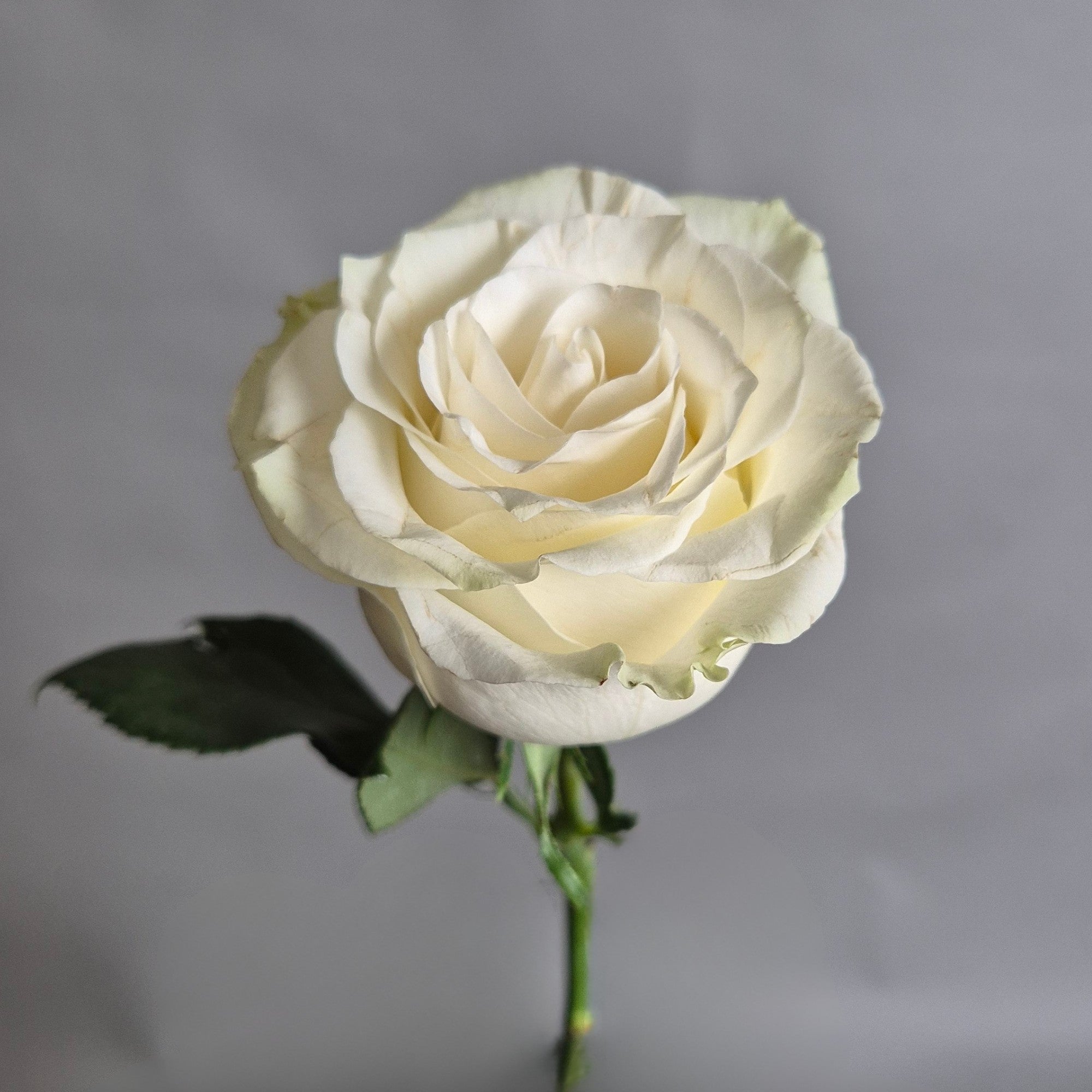 Compozitia florala este dominata de alb si auriu: trandafiri albi imaculati si o cupa spectaculoasa de Amaryllis alb (sau Crin imperial), acompaniate de puritatea florilor de bumbac.