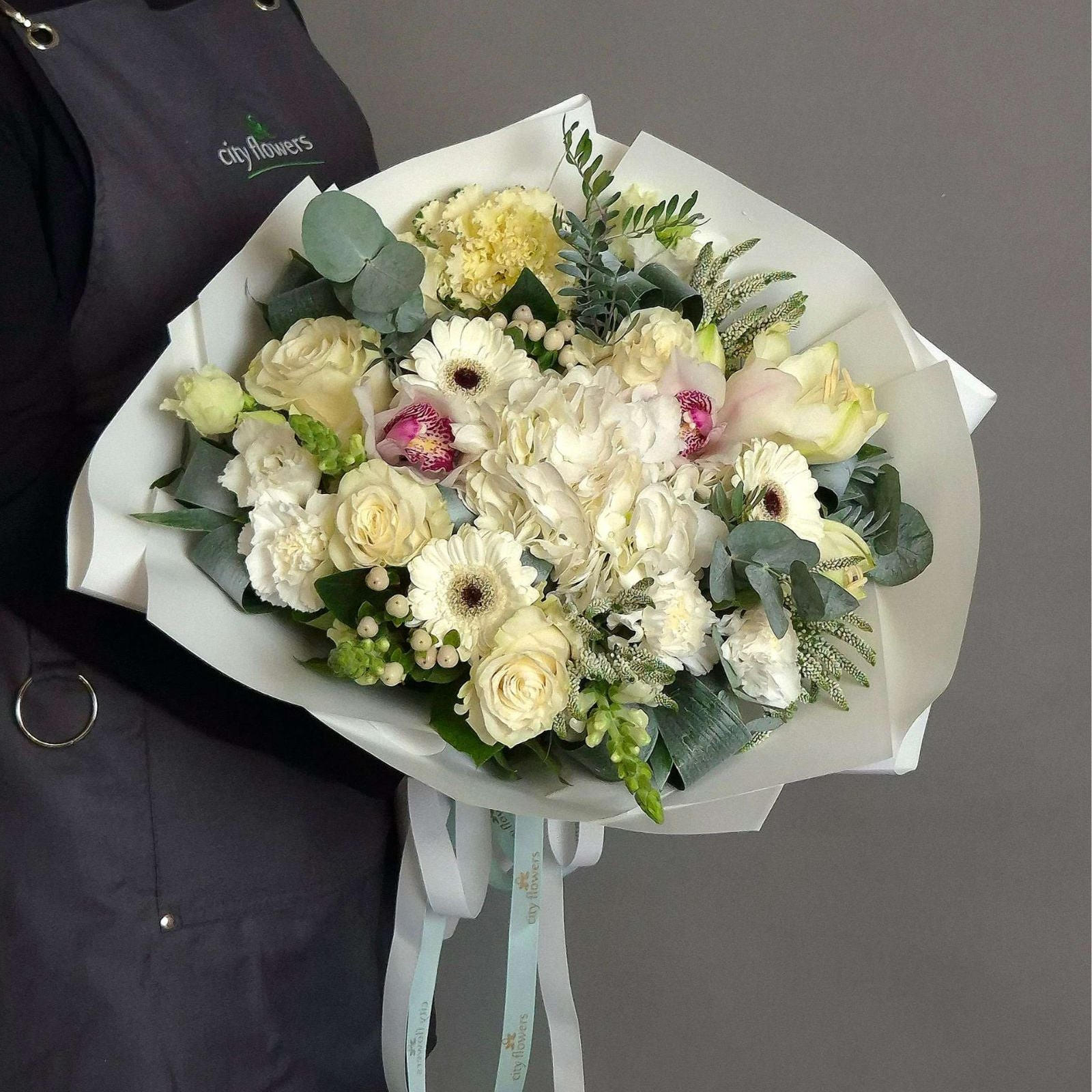 Buchetul All White contine un mix armonios de flori de sezon, alese cu grija pentru a oferi o varietate de texturi si forme. Fiecare floare, de un alb imaculat, aduce o nota de prospetime si delicatete. Insertiile de verdeata completeaza perfect ansamblul, adaugand un contrast subtil si natural.