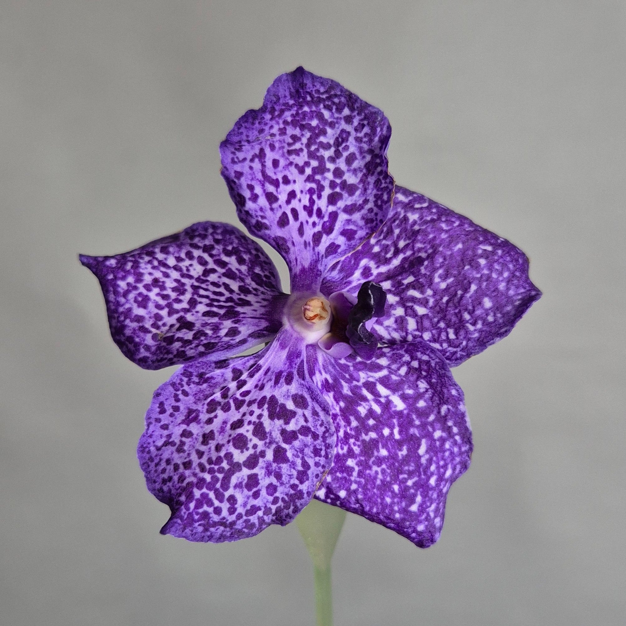 Vedetele buchetului sunt florile de Orhidee Vanda, recunoscute pentru modelul lor unic, pestrit, in nuante de violet intens. Acestea sunt acompaniate de trandafiri de gradina (Garden Roses) roz, un soi special cu deschidere larga si multe petale, care amintesc de bujori si emana un parfum subtil si proaspat.